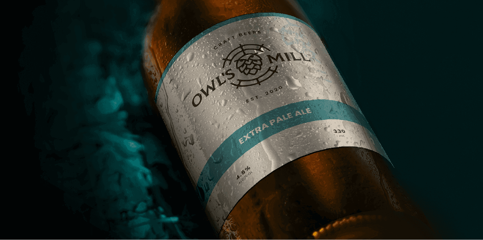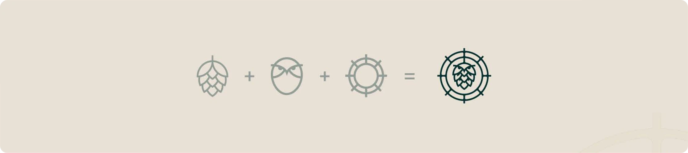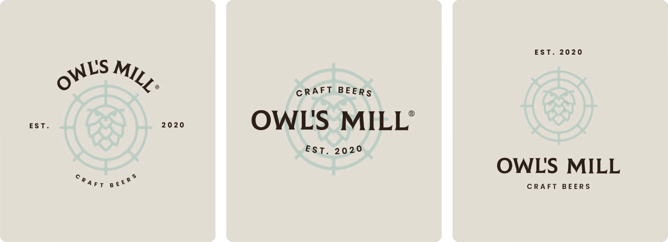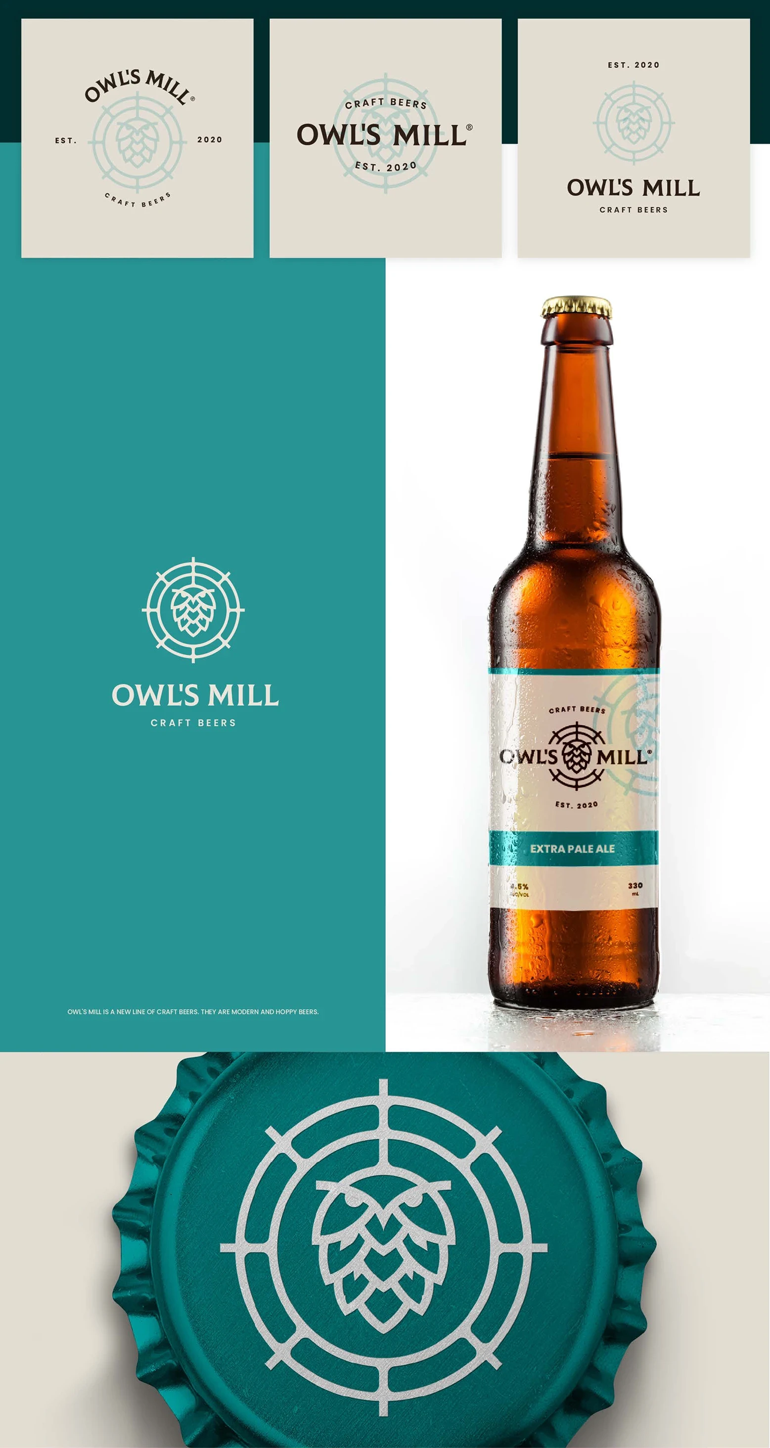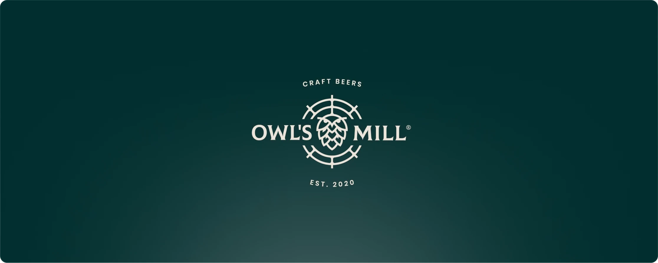 The concept was developed quite literally from the brand name itself. The logo integrates three elements into a single form: an owl, a reference to a mill through grain symbolism, and a hop cone representing beer. These components merge into a unified symbol designed to be both descriptive and memorable.